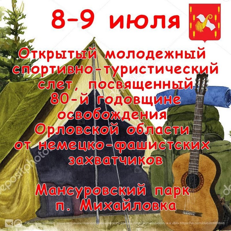 Напоминаем, что 8–9 июля на территории Мансуровского парка (п. Михайловка) состоится открытый молодежный спортивно-туристический слет, посвященный 80-й годовщине освобождения Орловской области от немецко-фашистских захватчиков. В нём примут участие сборные команды сельских и производственных коллективов, госучреждений, образовательных организаций. Участники команд – граждане РФ, достигшие 14-летнего возраста. Состав команды – не менее 12 человек (6 юношей и 6 девушек) и руководитель (не моложе 20 лет). Программа слёта состоит из творческих конкурсов и спортивных состязаний.