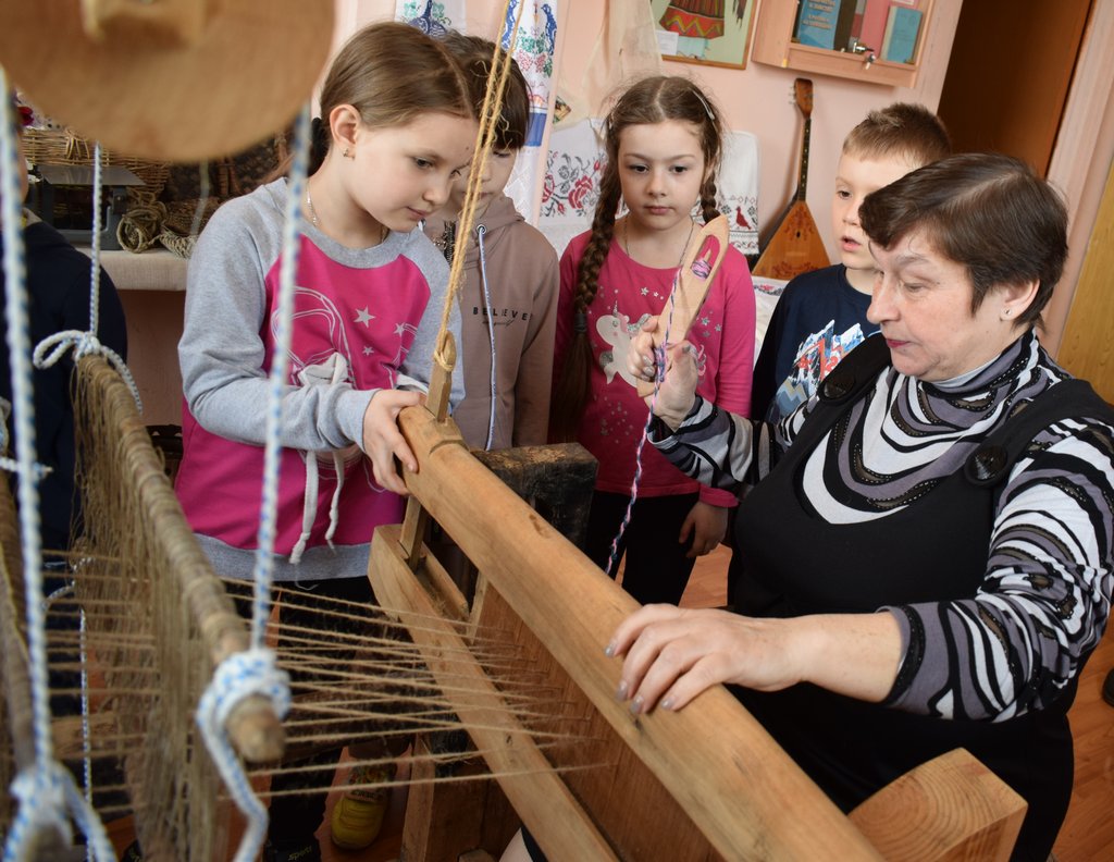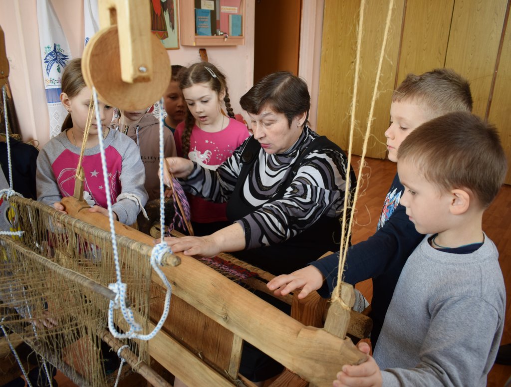 Ещё заведующая музеем Л.Е. Азарова показала ребятам, как на ткацком стане в старину ткали полотно и половики.